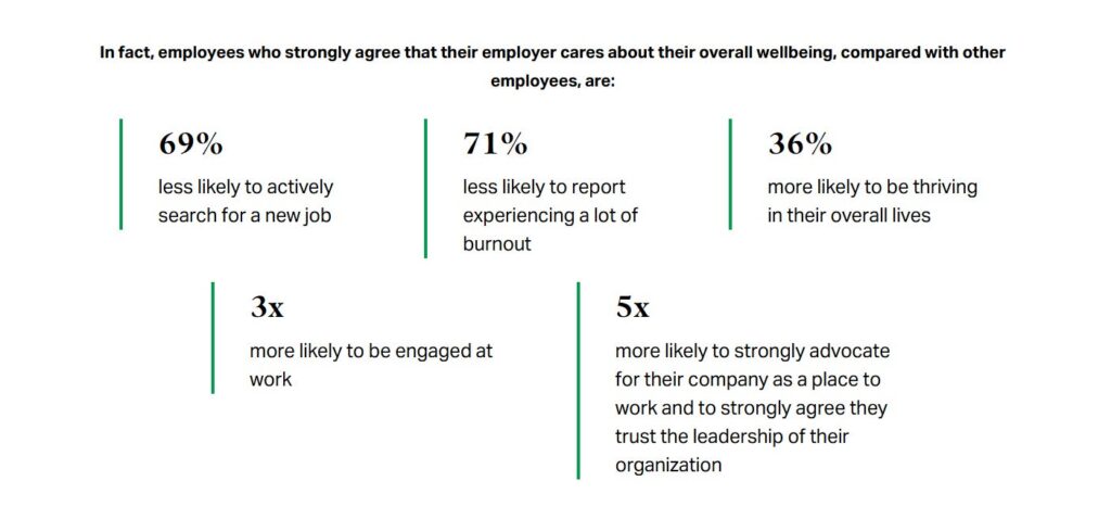 Tuo tarpu tie gerovės veiksmai, kurie pataiko į poreikių dešimtuką, iš tiesų teikia didžiulę naudą. Tyrimai rodo, kad darbuotojai, kurių įmonė rūpinasi jų gerove, net 71 proc. mažiau linkę į perdegimą, nors į darbus įsitraukia 3 kartus labiau. Maža to, 67 proc. darbuotojų sako, kad nesidairo darbo kitur ir net 5 kartus labiau rekomenduoja savo darbdavį kitiems.